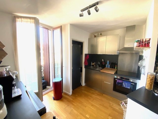 Le salon est ouvert sur la cuisine qui donne sur un petit balcon.
